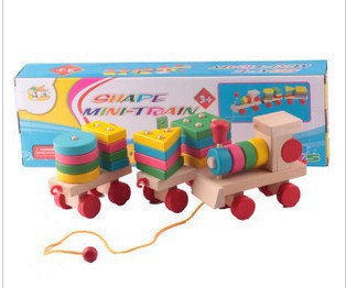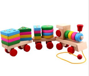The train is composed of four different shaped wooden blocks, which are round, triangle, rectangle, and square; you can put them together.