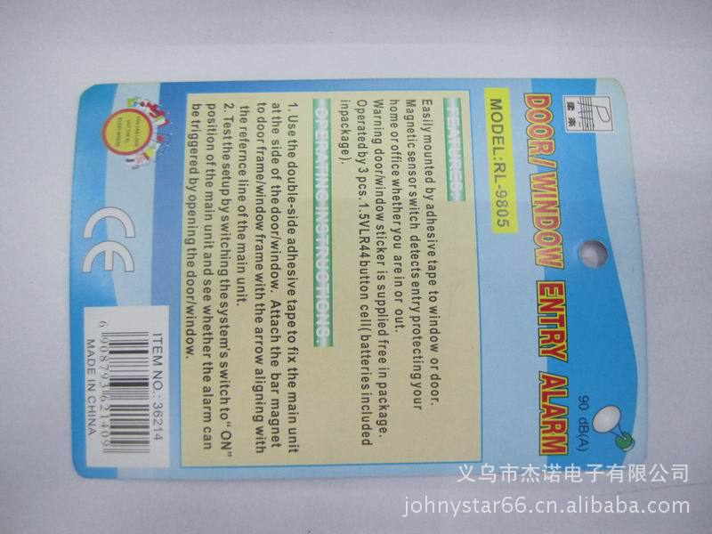 Rl-900 burglar alarm. The new device, with an alarm light mounted on a door or window, will emit a loud 105 db alarm if a thief enters or climbs through the window. No, just turn off the switch. This type of alarm USES magnetic induction principle. It is easy to use, low price, stable quality and long service time. It is sold to many countries and regions all over the world. 400 PCS/CTN MEANS: 42.5 * 32.5 * 59 cm GW: 16kgs/ CTN, NW: 15kgs/ CTN with 2 inner boxes.