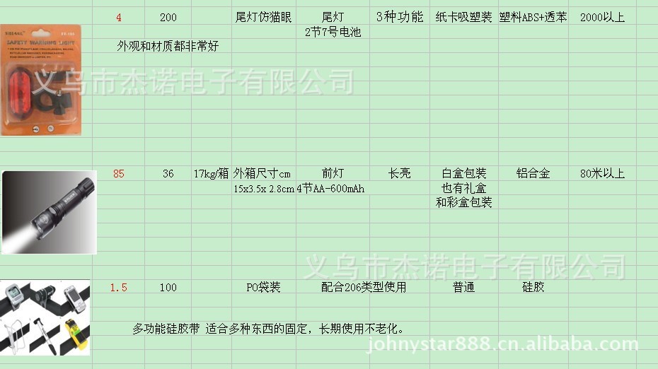 JOHNYSTAR has long been producing and processing a wide range of electronic goods. The price is low, practical and the packaging is exquisite and generous. The quality is too stable. JS - 9069. 5 bicycle lights taillight bike lights LED lamp, with a flash, slow flash, long bright, close four functions, stable quality, color card packing, to prevent the occurrence of traffic accidents because of poor sight, not only can use the bicycle can also be used in electric cars and other products, convenient installation, after the switch, durable! Exported all over the world! Insert card packaging 300PCS/CTN MEANS: 57x40x43.5cm GW:13.5KGS NW:12.5KGS OPP bag packaging 600PCS/CTN, MEANS: 58x40x35. 5CM GW:27KGS NW:26KGS Single product size: 7x4.5x2.5cm 2 section 5 batteries Customized packaging or printing can be made according to customers' requirements. It is the best choice for marketing promotion or advertising gifts. Long-term mass production and processing. Welcome foreign businessmen to purchase in large quantities! |