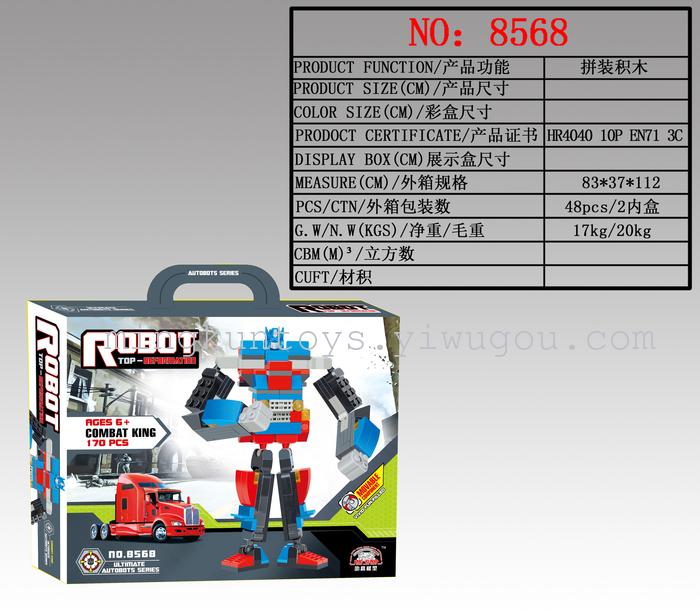 About Product:Cartoon toy building blocks, DIY assembled robot car, bright color, materials and environmental protection, packaged, is the child's gifts of choice.