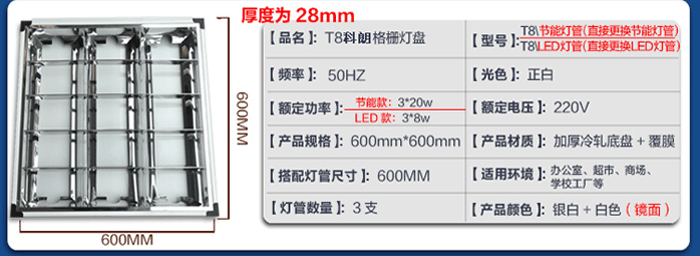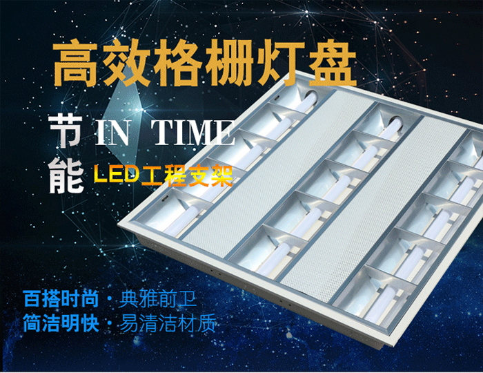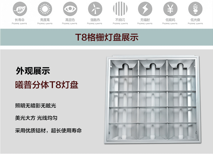格栅灯:一种照明灯具,适合安装在有吊顶的写字间。光源一般是日光灯管。分为嵌入式和吸顶式。底盘采用优质冷轧板,表面采用磷化喷塑工艺处理,防腐性能好,不易磨损、褪色。所有塑料配件均采用阻燃材料。