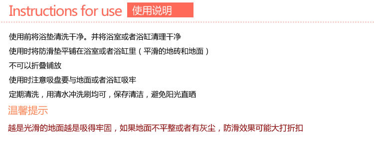 Related Tips Instructions and Safety Tips: The product comes with multiple powerful suction cups. Before using, please clean the floor with a wet mop to ensure a smooth surface (the suction cups on the anti-slip mats will easily adhere to wet tile floors). Alternatively, you can spray water on the tile floor and lay the anti-slip mat before stepping on it a few times to ensure a firm attachment. The smooth floors in bathrooms are often overlooked as a potential safety hazard. They can become slippery when steam, water, or moisture condenses, leading to falls and sudden accidents. With this anti-slip mat, you can significantly enhance the safety of activities in the bathroom, making it a safer choice. |