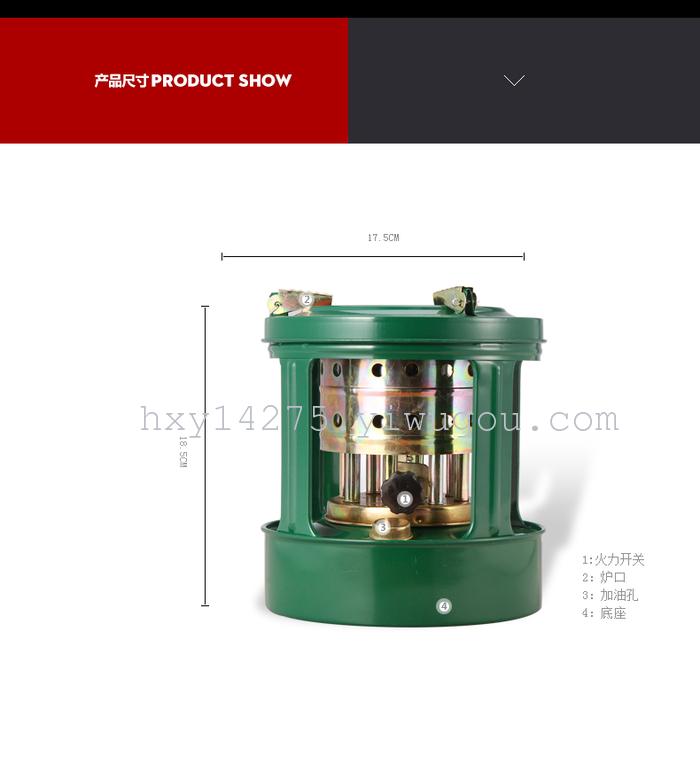 The product parameters: Stoves classification: Oil picnic stove body structure: split application environment: ordinary outdoor environment Brand: Yan wheel item: 168 types of fuel: Kerosene Specifications: see Figure weight: see maximum fire burning time: 1-3H Average boiling time: 5min whether the ignition device: origin: Chinese Color: green fuel: whether or not