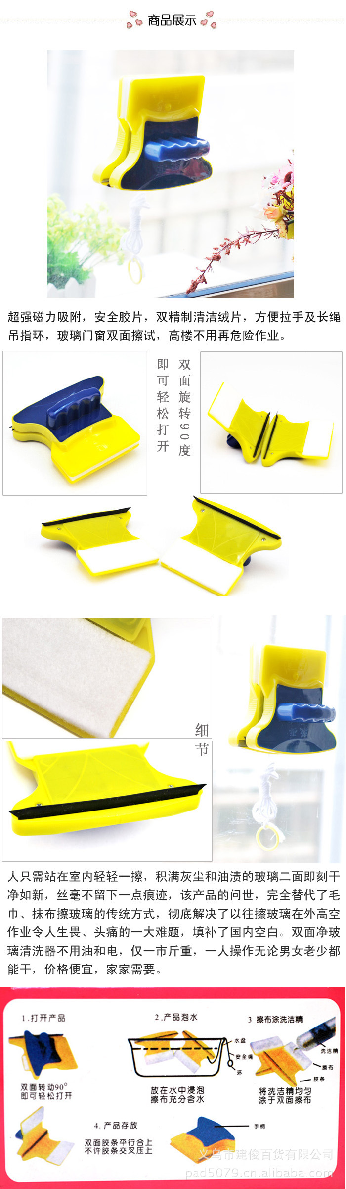 品牌:天天 货号:双面玻璃擦 材质:塑料 类型:双面擦 产地:永康 箱装数量:60 贸易属性:内贸+外贸 价格段:10-20元 产品上市时间:2012春 货号:双面玻璃擦 ???? 材质:塑料 ?? 产地:浙江永康 类型:双面擦 ???品牌:富涛塑料制品厂 ?? 贸易属性:内销和外贸 箱装数量:60个 ? ?毛重:29kg ?? 箱规:50*38*37 厂家直销,量大可联系本厂详谈,本品 60个一箱,欢迎批发,义乌市区10箱以上送货。 ? 注意适用范围:3-5mm单层玻璃???? 【产品重量】:约500克??????包装:彩盒? 产品优点:超强磁力吸附,外壳坚固,胶条抗老化,安全胶片,内附清洁绒片《2对4片》