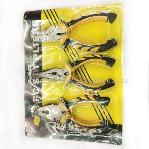 This product includes 6-inch steel wire, 6-inch slant-tip, and 6-inch sharp-tip pliers. The surface of the pliers is polished, and the handle is a black-and-yellow massage handle. The pliers are made of plastic shell and cardboard. They are fixed with paper clips.