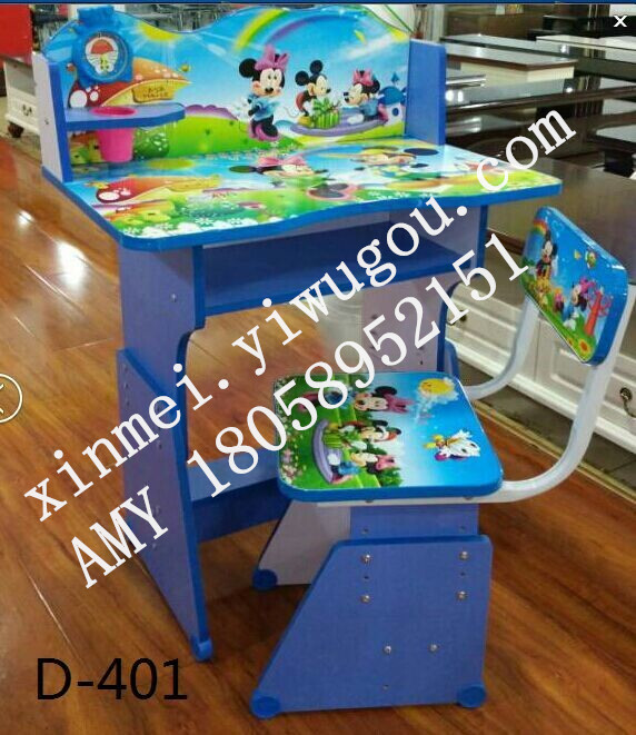 Model: D-401. Product Name: Full-board Children's Study Table. Table Specification: 70X45X86CM, Chair Specification: 33X39X65CM, Table Height Adjustable. One Set in One Carton, Five-layer Cowhide Cardboard Box, Convenient for Transportation.