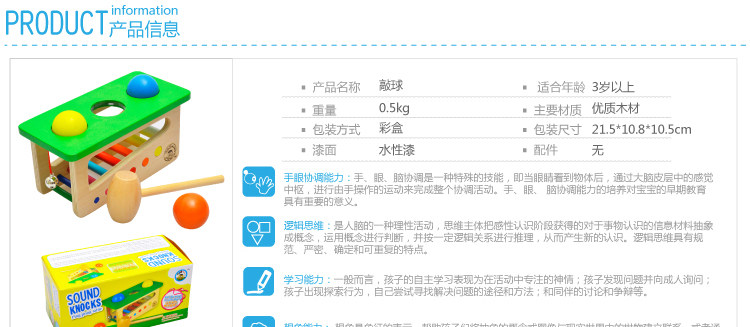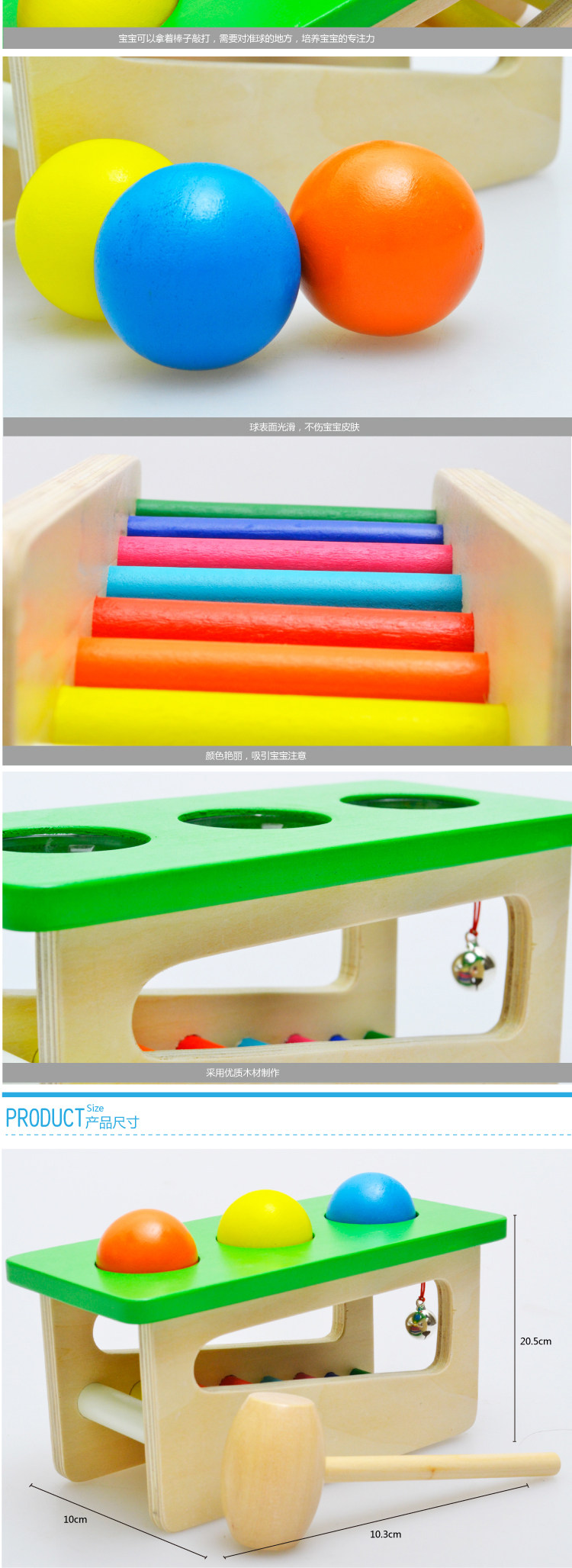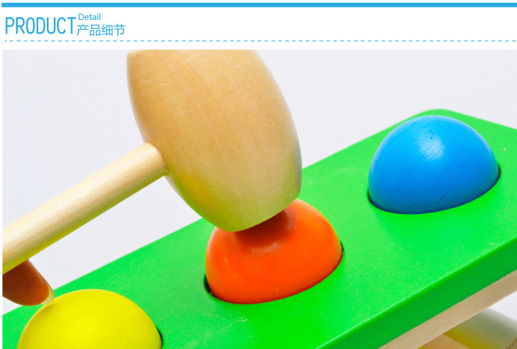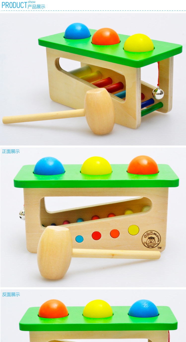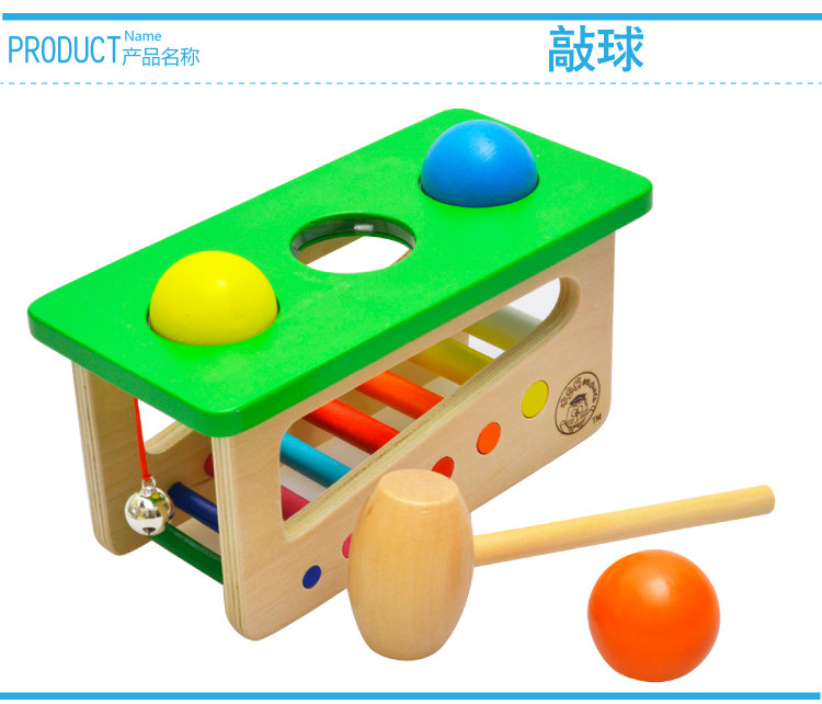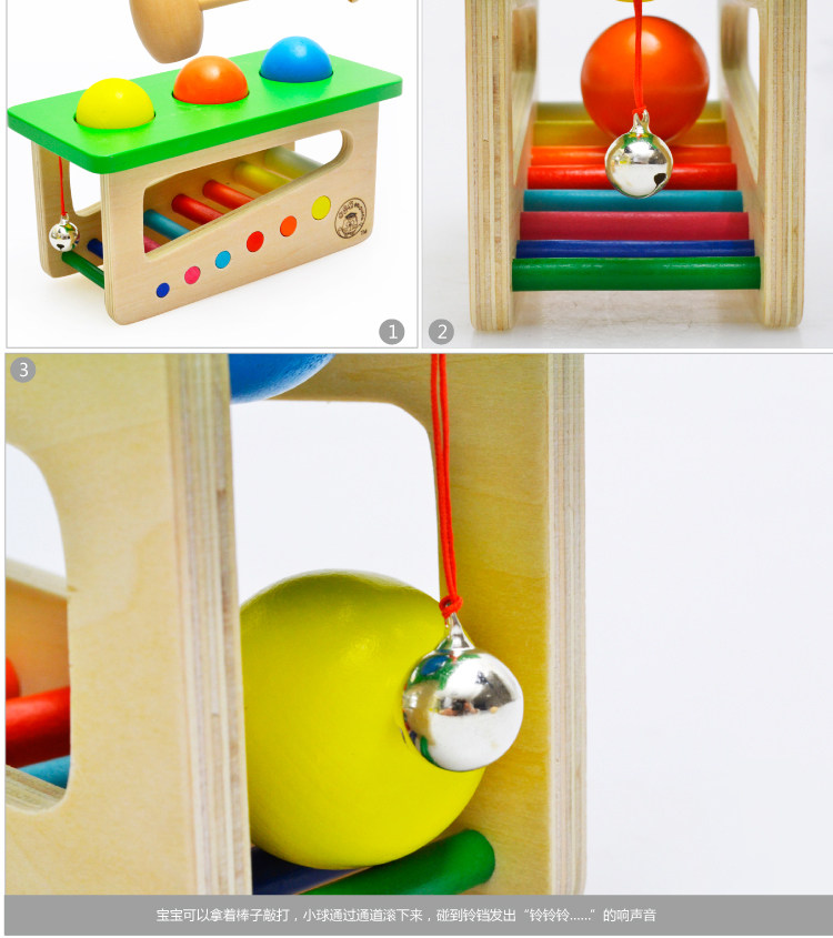 Wooden sound ball hitting table, baby knocks joy, with bell.
