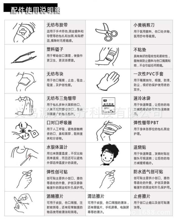 Yiwu power source Medical Technology Co., Ltd. is a first-aid kit, medical supplies for the main business of manufacturing enterprises. The company's main: all kinds of first-aid bag, elastic bandage, dressing non-woven fabric, medical gauze products, band aid, tape, cotton and disinfection products, such as medical supplies, operating at the same time, sales of electronic temperature meter, pressure gauge, and so on household medical electronic products. Company is committed to become China's most professional, the most complete category of emergency products manufacturers. After many years of efforts to explore, the company's first aid kit varieties as many as military, car, outdoor, home, sports and other nearly a thousand kinds of style, and get the majority of customers.