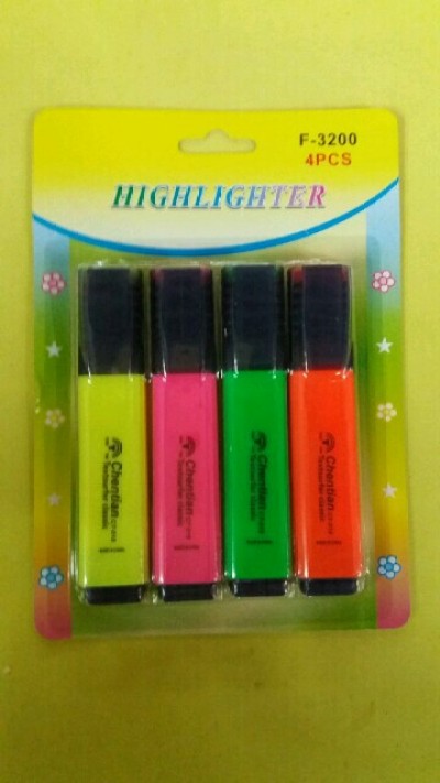 Four fluorescent markers with international eco-friendly ink, bright colors, smooth writing, and reasonable prices.