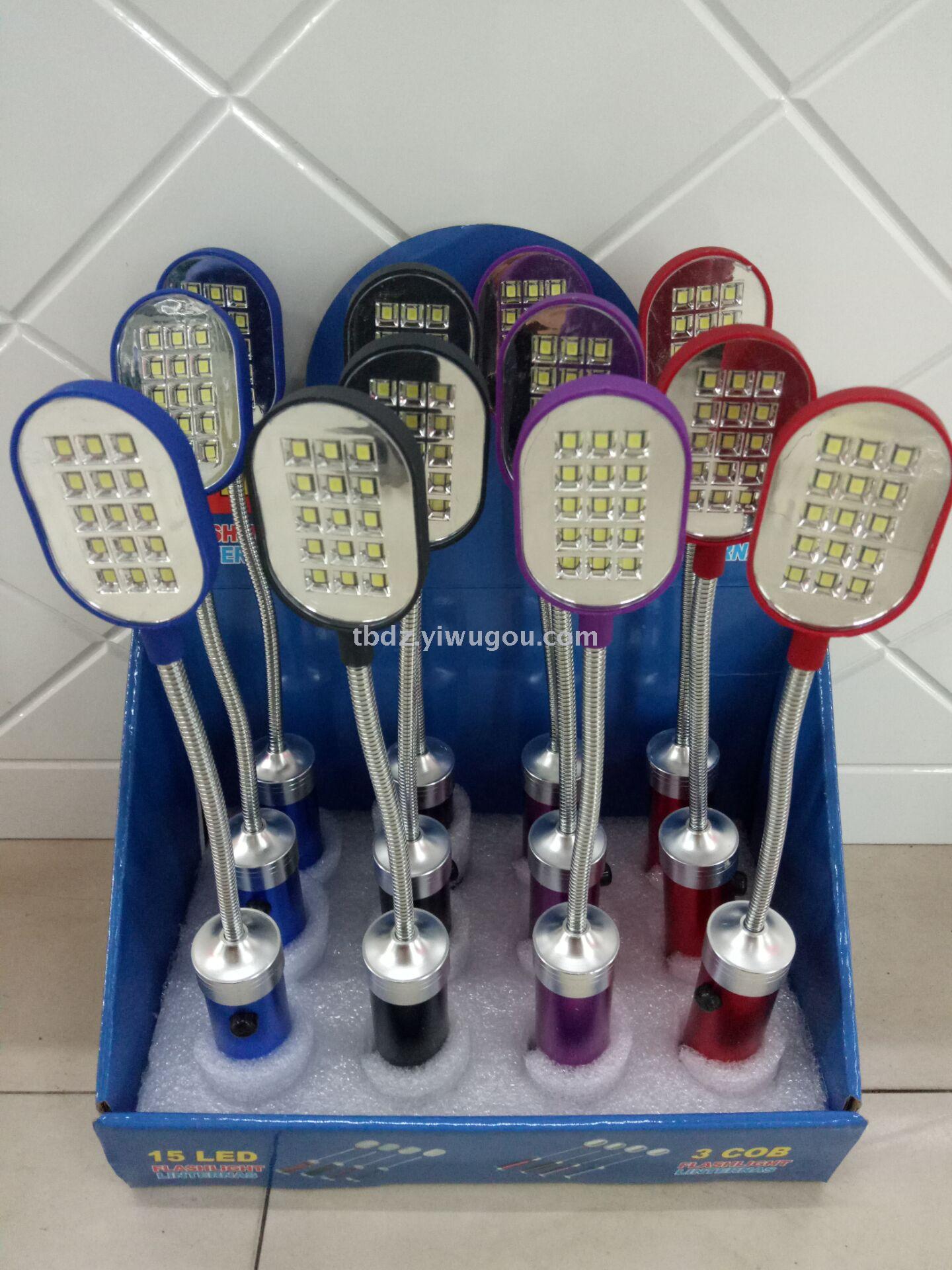 About Product:Hot-selling aluminum working lamp, small lamp flashlight with hose book lamp, aluminum alloy plus ABS material spray elastic rubber paint, 15 LED patch bulbs, flexible hose rotation, 3 AAA batteries, tail with strong absorbent, red, blue, black, purple mixed pack, display box packing each box 12 240PCS