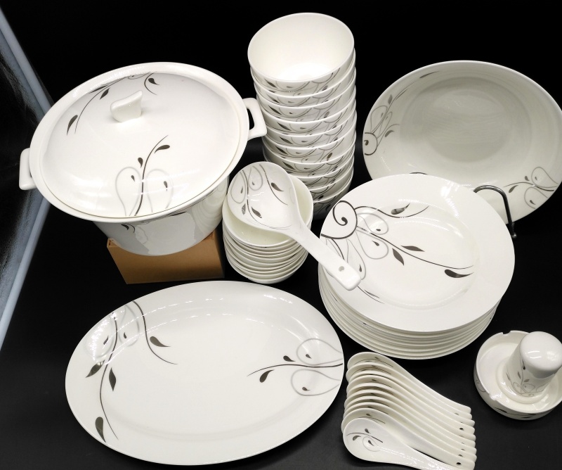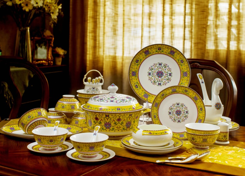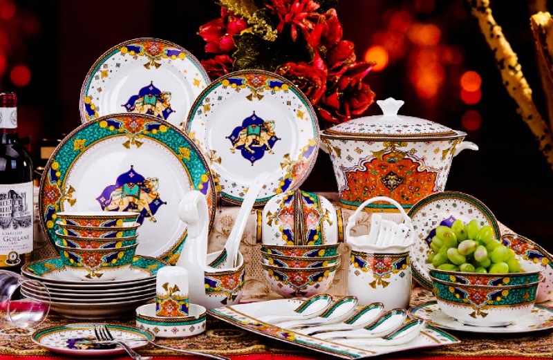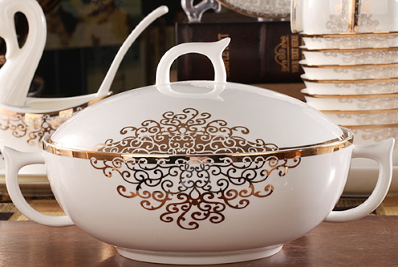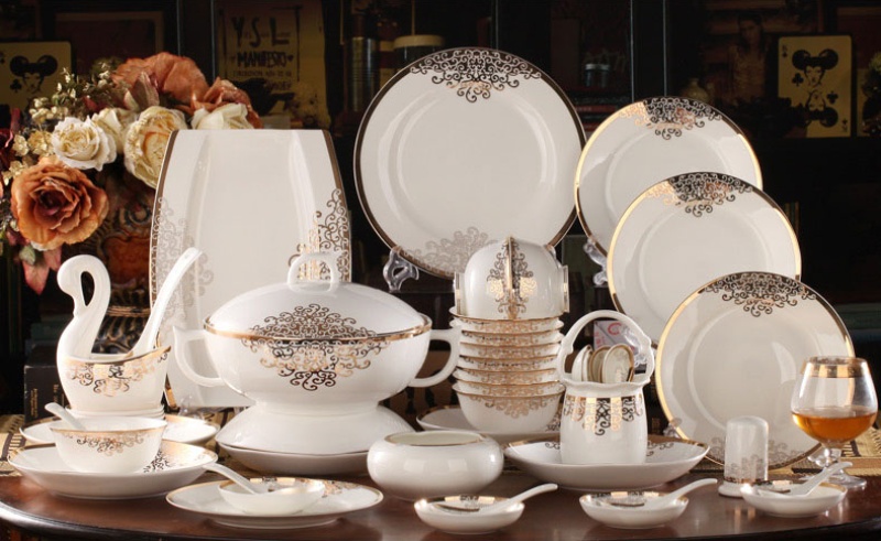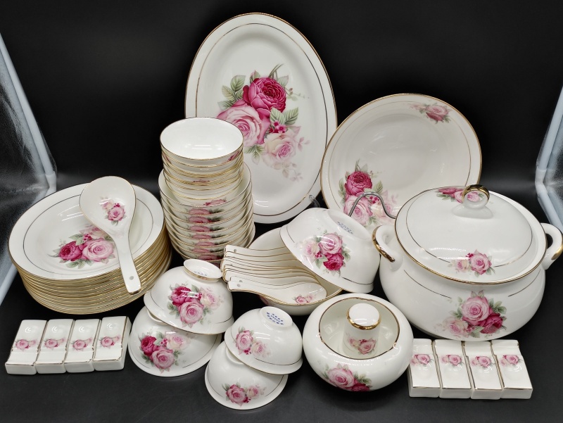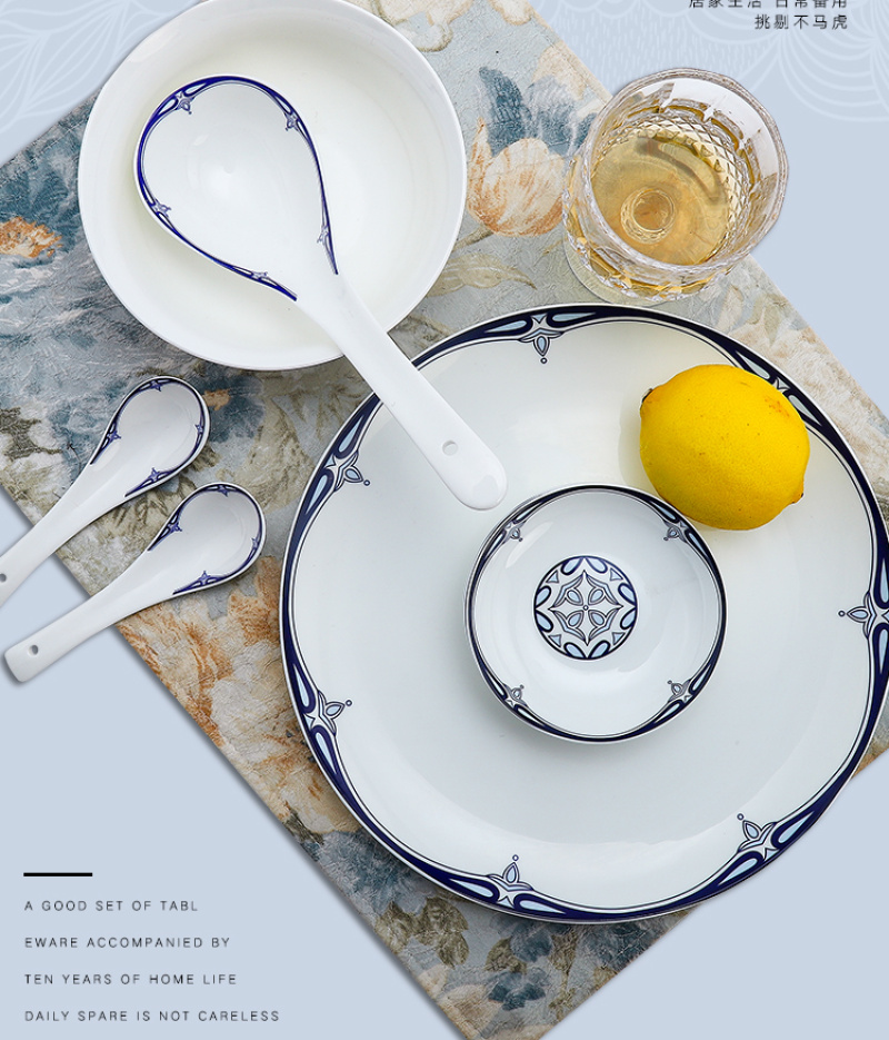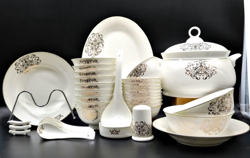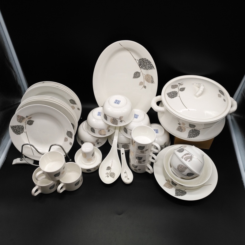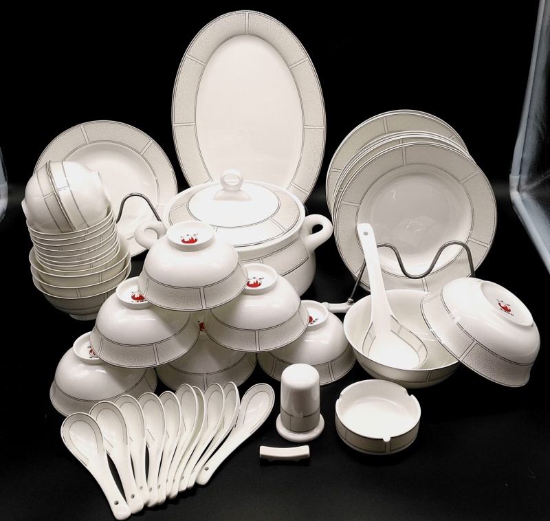 A set of 2 bone china tableware, total of 60 pieces. It includes 10 bowls, 10 plates, 10 dishes, 10 spoons, and 10 chopstick racks.Four large bowl-shaped dishes.A palace-style pot, a large soup ladle, a large fish plate, a large round plate, an ashtray, and a toothpick box.