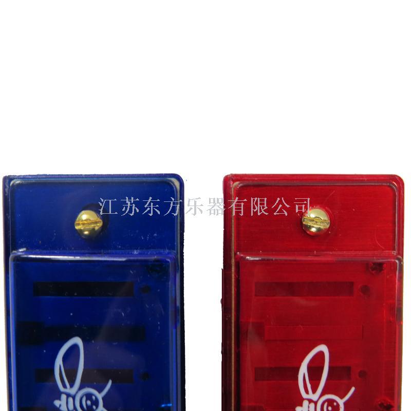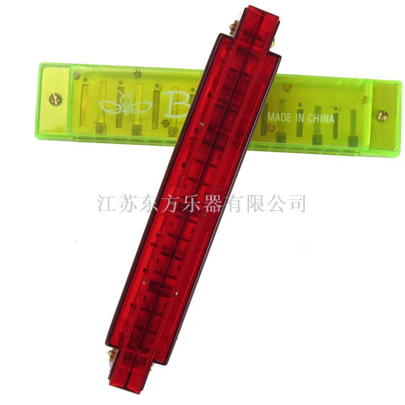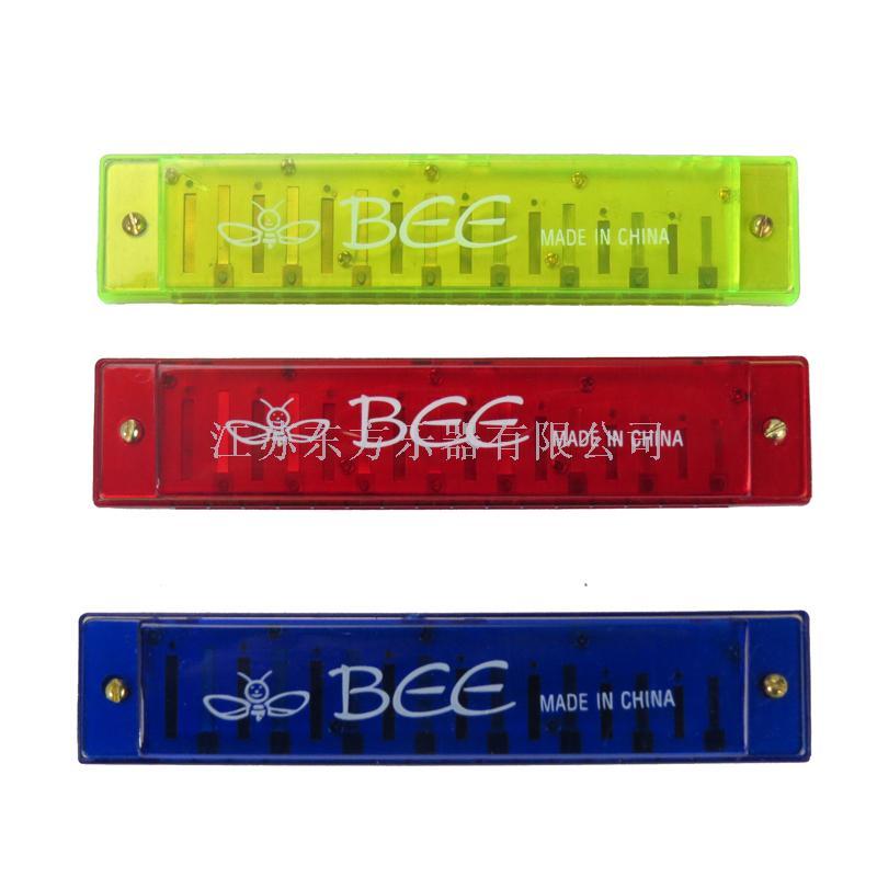 16-hole aluminum base plate transparent plastic shell harmonica, Bee brand, harmonica colors are red, blue, green, orange, each harmonica into a toothpaste box, 12/inner box, 240/carton.