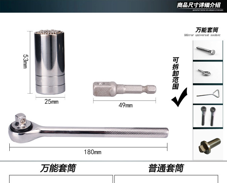 About Product:Accessory type socket head brand Gator Grip Model 7-19 standard metric material tool steel characteristics ordinary wrench shape single head wrench edge size 19 surface treatment polishing chrome plating processing customization no weight 500(g) specification universal sleeve + quick wrench + connecting rod, single universal sleeve