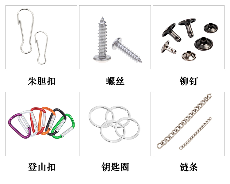 Our store mainly deals in key chains, key rings, lobster clasps, card holders, beaded chains, eyelet, button heads, pig gallbladder clasps, magnetic clasps, needle clasps, square clasps, three-position clasps, half-round clasps, round clasps, copper, iron, and aluminum rivets, springs, eyelet, screws, washers, hinge clasps, crafts, picture frames, and accessories for luggage and bags.