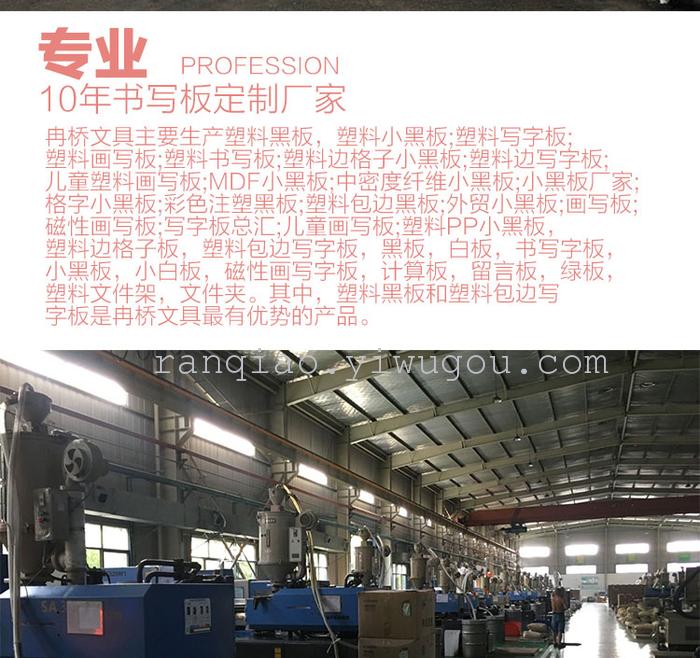 Ran Qiao Ningbo stationery is located in the "world of stationery production base----Zhejiang ninghai" Ran Qiao stationery mainly produce plastic, plastic Board, white board, chalkboard, small plastic pp Board, wooden board, MBF writing pad, file boxes, bookends, plastic pencils, plastic HB, colored pencils and other plastic products. Products are exported to Europe, America, Japan, and Korea in Africa and other countries favored by customers, momentum is good. Ran Qiao stationery now has advanced production assembling lines workshop, as well as other types of injection molding machines, extruders, punching, creasing machines, POF heat shrink packaging machine and other advanced equipment. Ran Qiao stationery seriously implementation "times, and refined innovation, and customer gratified" of quality approach, always insisted "humanist" of operating concept, to "solidarity, and self, and pragmatic, and struggle, and innovation" for enterprise spirit support, believes in "development is hard truth" of wisdom, followed "innovation is national progress of soul" of taught, constantly pursuit excellence, beyond self, pioneering enterprising, again cast brilliant. Sincerely happy customers come to negotiate business, friendship and cooperation!