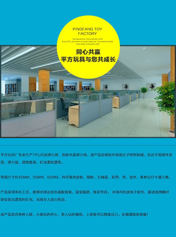 Square Toy FactoryProfessional production of TPU flash elastic balls, also known asCrystal elastic ballThis product is made of eco-friendly and green high-polymer materials, which is resistant to compression and does not easily deform or change shape. It has strong elasticity and high transparency, with soft and beautiful lighting. The product is available in regular sizes of 45MM, 55MM, and 65MM. It can be filled with gold powder, fine powder, pentagon stars, ribbons, fish, gold threads, and various stuffed cartoon characters. The product uses a purified water process to achieve a crystal-like effect, making the water ball transparent and sparkling. Inside the water ball, there is an electronic component that will emit beautiful lighting when vibrating or jumping, which is pleasing to the eyes. This product is suitable for all ages, making children happy, elderly people happy, and office workers can release pressure.