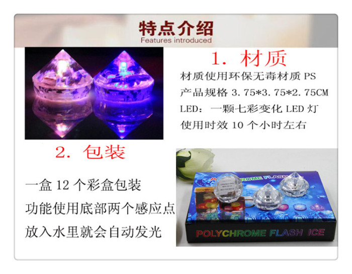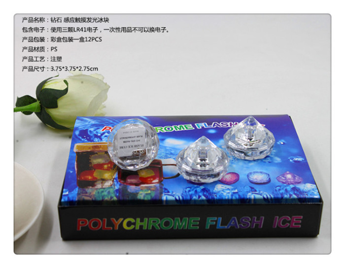 The LED electronic ice cubes are composed of food-grade PS material and electronic components. The two small dots at the bottom of the ice cubes have the feature of lighting up when they come into contact with water (liquid sensing), and they resemble real ice cubes in appearance.