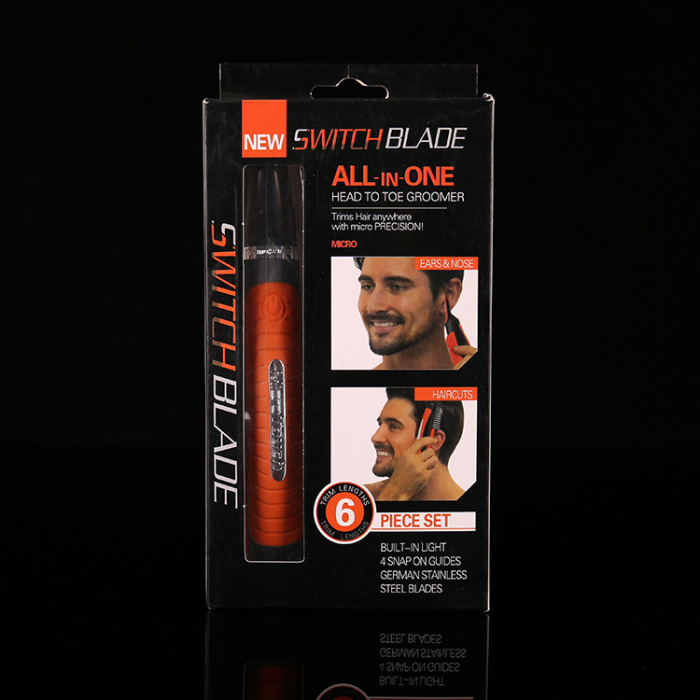 Product Material: ABS + Blade Crate dimensions: 58*41*53cm Packing Quantity: 96 sets/container Gross/Net Weight: 13/14kg Micro Touch Switchblade 2in1 design includes lighted mini and full-size trimmers for head-to-toe grooming. It's powerful enough for the tough stuff yet gentle enough for the most sensitive skin. Features precision snap-on guides for superior control. MicroTouch Switchblade, as seen on TV, is great for keeping side burns.mustaches and beards razor sharp Perfectly grooms bushy eyebrows and removes unsightly ear hair Requires 2 AAA batteries not included Includes MicroTouch Switchblade and three precision snap on guides