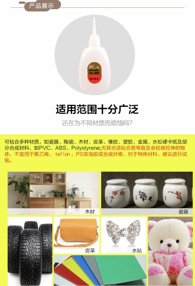 Factory Direct sales, no whitening, fast adhesive time, convenient use, widely used in rubber, plastic, metal, leather ornament and other materials