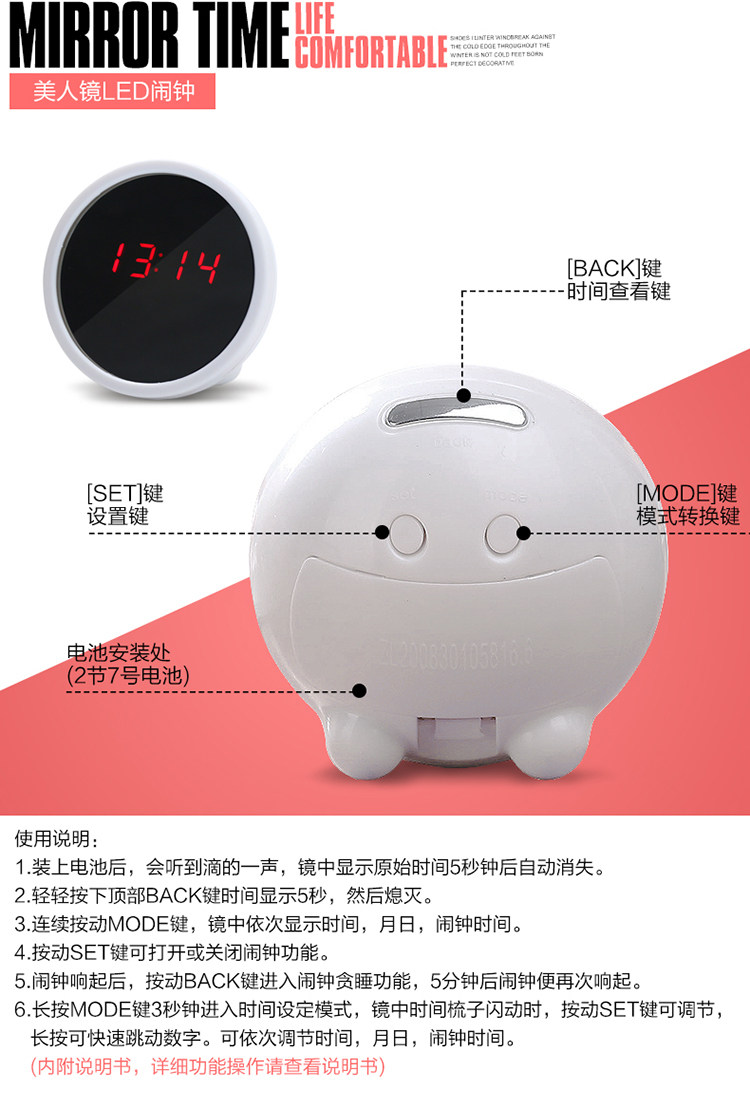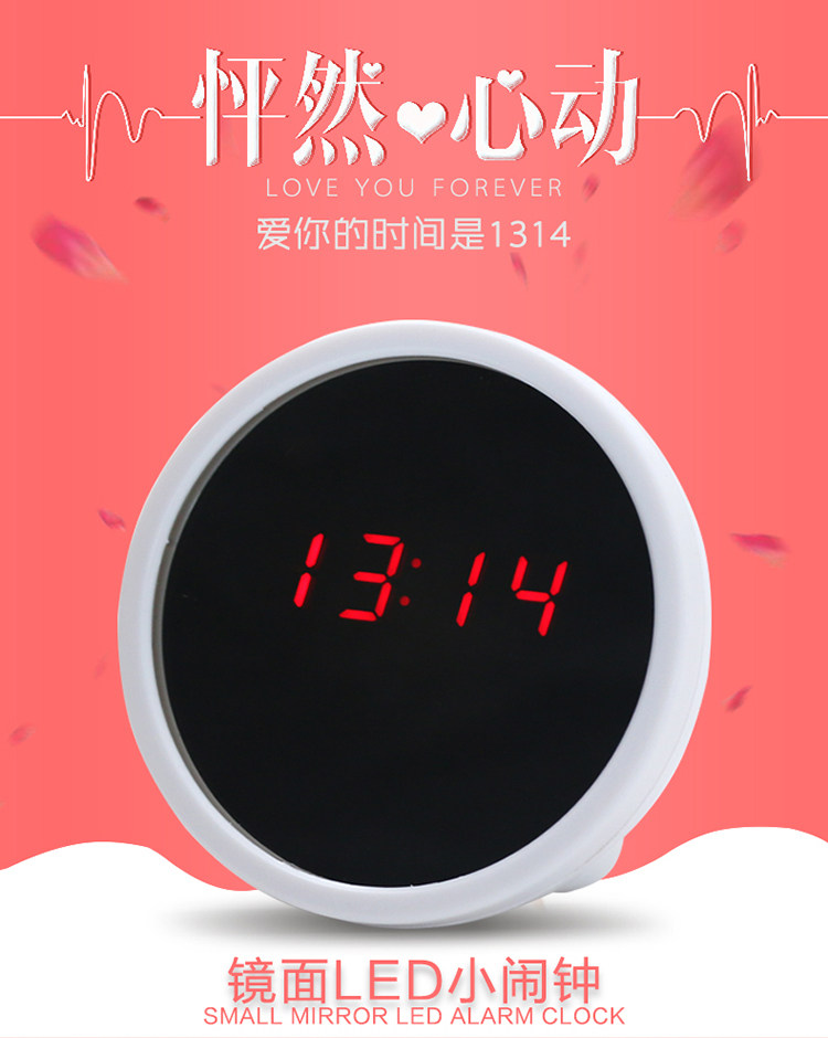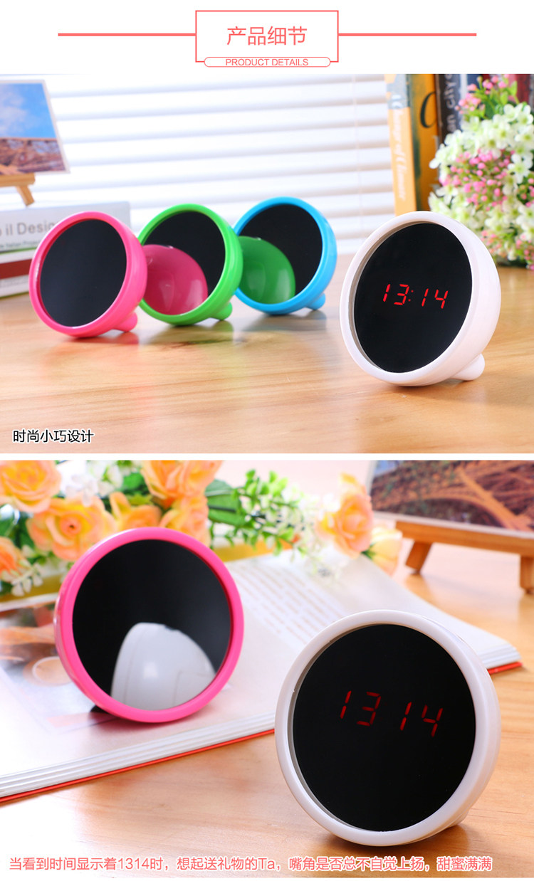 She looks like a delicate Taiwanese-style small mirror, which can be used as a mirror when there is no alarm clock.It's amazing, but no one would ever guess that her mirror is also a multi-functional LED clock.Gently press the silver strip button at the top, and the mirror surface miraculously displays the time,Red LED digital displays will make everyone's eyes pop, leaving them amazed and envious!