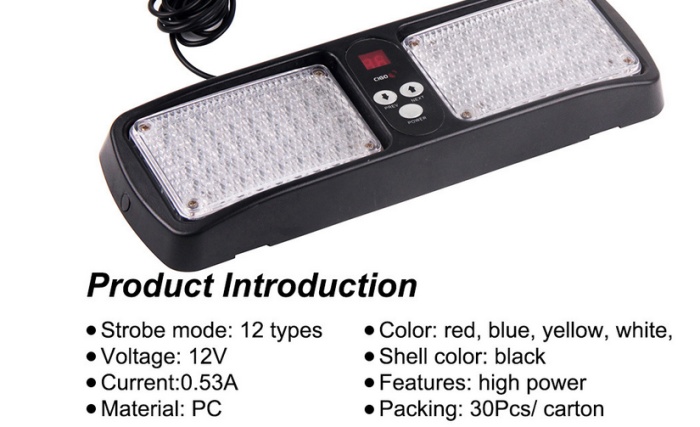 产品功能:86颗高亮LED 12种闪烁方式.点烟器插头.