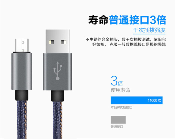 • Super compatibility, charge + 2 syncretic function of data transmission, bold copper conductor, fast charging mode, denim with high quality, durable, import cowboy appear more strong and greatly enhance the service life and durable and not knot.