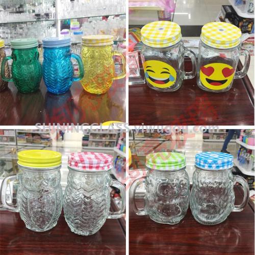 New design Mason jar glass cup smile face with handle drinking glass with color