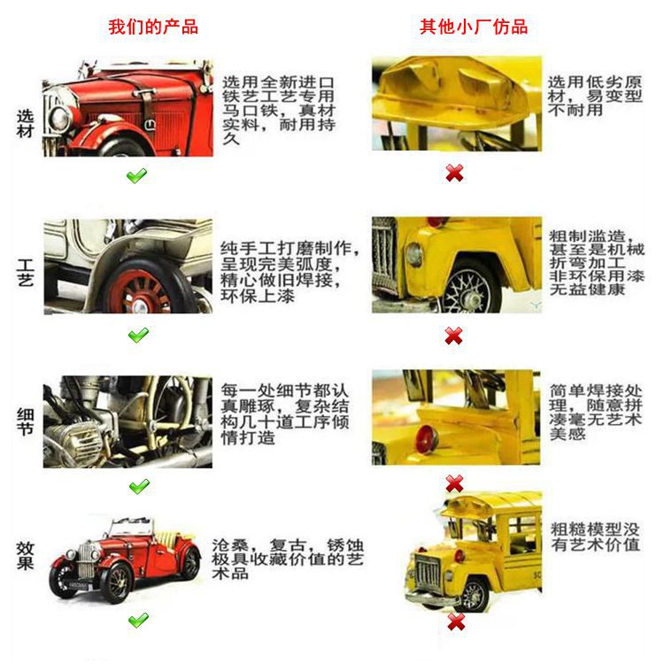 本店专业销售各种手工做旧的铁艺复古模型、摄影道具、酒吧装饰、咖啡厅装饰、家居装饰、陈列道具等。产品包括各种规格的仿古老爷车、军车、摩托车、放映机、飞机、电话机加油机、留声机、电视机、邮筒等等,品种繁多,欢迎新老客户惠顾。