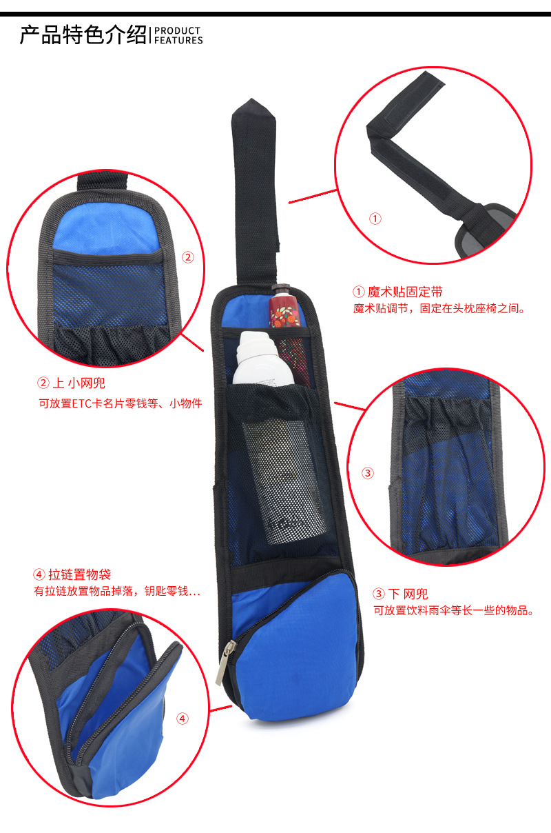 The upper end of the product is equipped with adjustable elastic tearable magic cloth sticker, which can be fixed at the joint of headrest and seat.