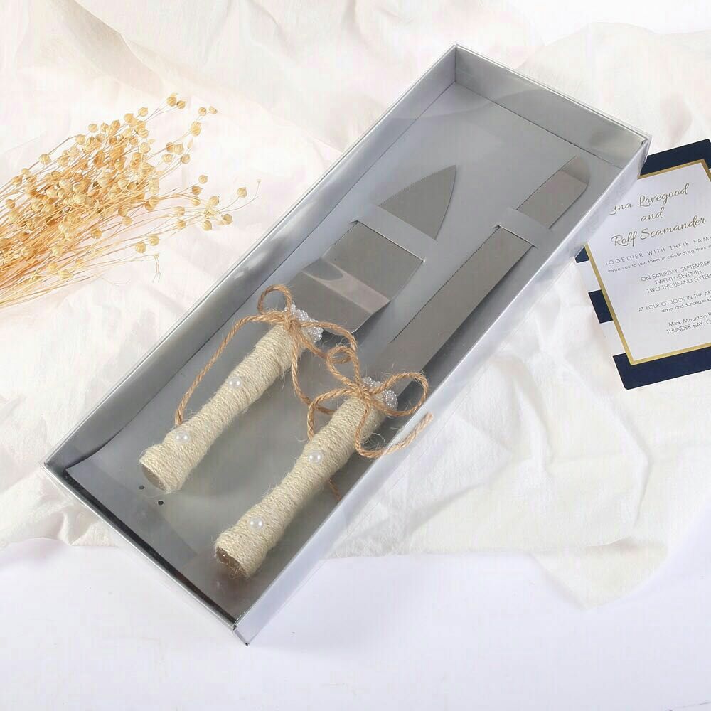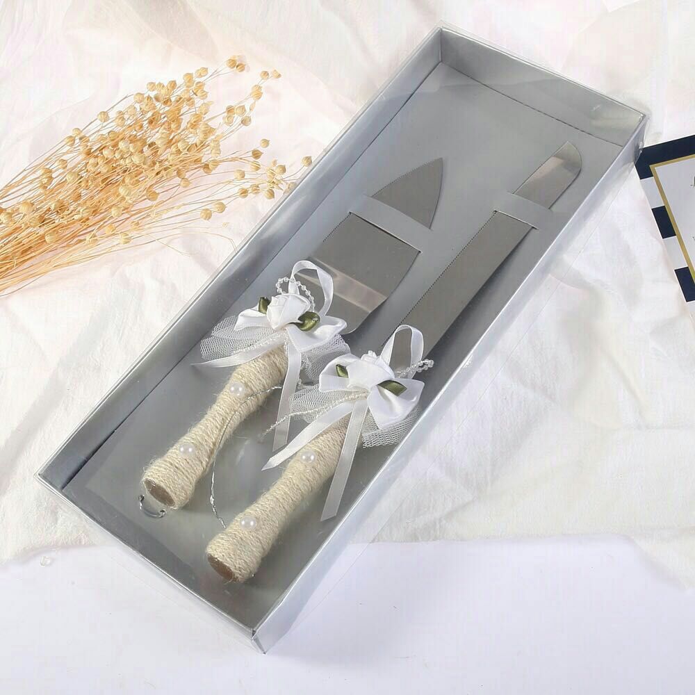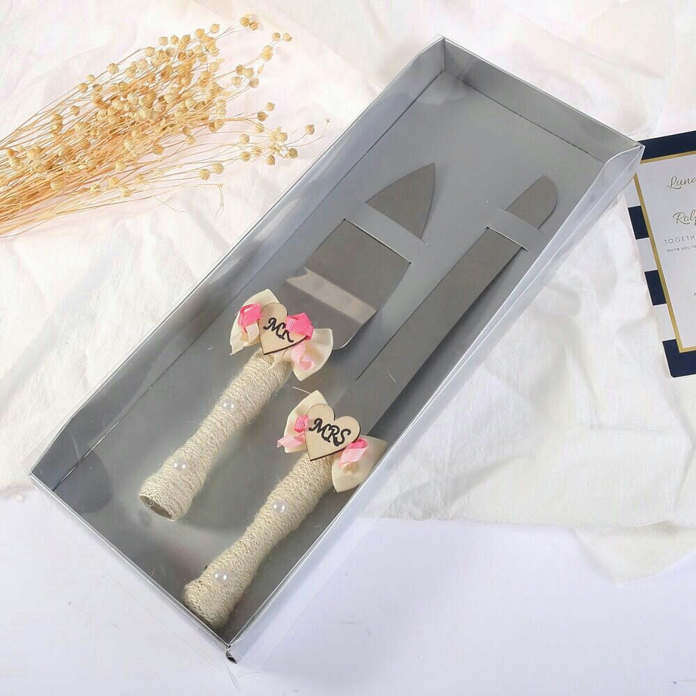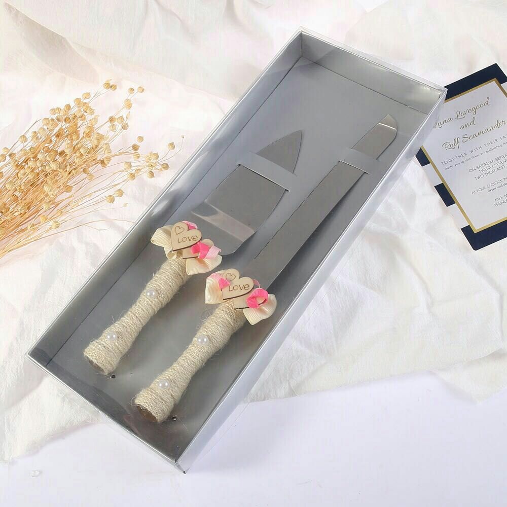 love heart wooden bow wedding knife shovel brown linen lace stainless steel cake knife shovel
