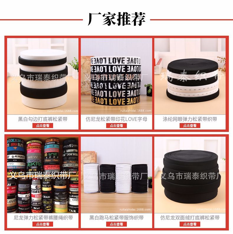 Yiwu Ruite Weaving Belt Factory is a professional production enterprise that specializes in producing various woven products such as jacquard elastic, edge stitching, and no-shuttle; elastic and non-elastic woven belts. We have been committed to the wholesale of elastic belts and the design, development, production, and sales of woven belts. Our company can dye the products according to different requirements of customers, and the products have characteristics such as light resistance, high-temperature resistance, wash resistance, wear resistance, and no fading. They are widely used as auxiliary materials in industries such as clothing, shoes, hats, bags, toys, automobiles, crafts, medical devices, etc. Our company was established in 2003, and through the joint efforts of all members of our company, Ruite Weaving Belt has become one of the outstanding elastic belt suppliers in the domestic market.