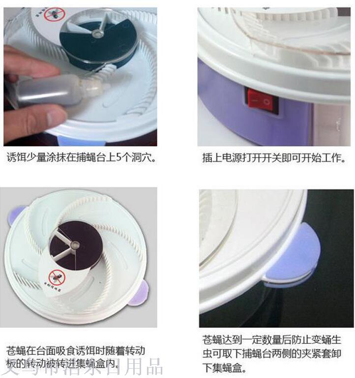 This product is suitable for all families, hotels, inns, restaurants, canteens, markets, supermarkets, stewed food shops, farms, factories, etc. Place this product in the area where flies often gather. Use the honey water provided by the product as bait, or choose vinegar or fishy-smelling or sweet things according to your own situation to lure the flies to this product. Then, the product's rotating plate will rotate the flies to the collection box.