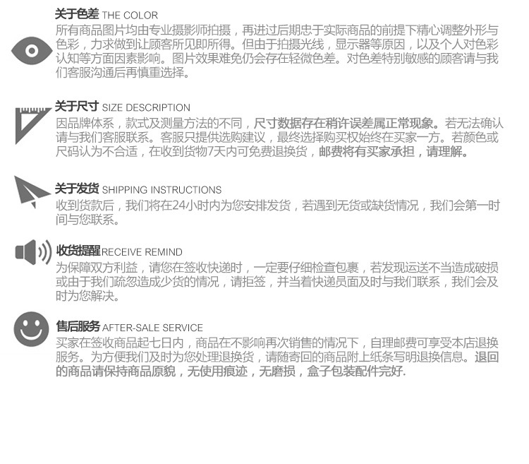 | Contact customer service | Please use want want way to contact, affirm identical customer service consultation, can get more professional service! Due to the large amount of consultation, want want is usually in the state of explosion. If you haven't received a reply for a long time, you can choose self-service shopping according to the description. Please fill in the color/size/express information directly in the remarks. If you have special needs to leave a message, we will deal with them one by one |