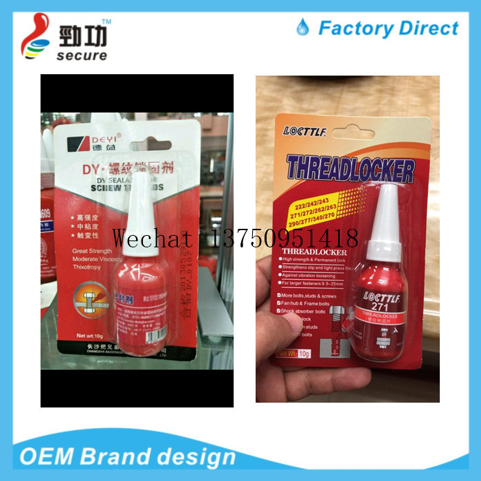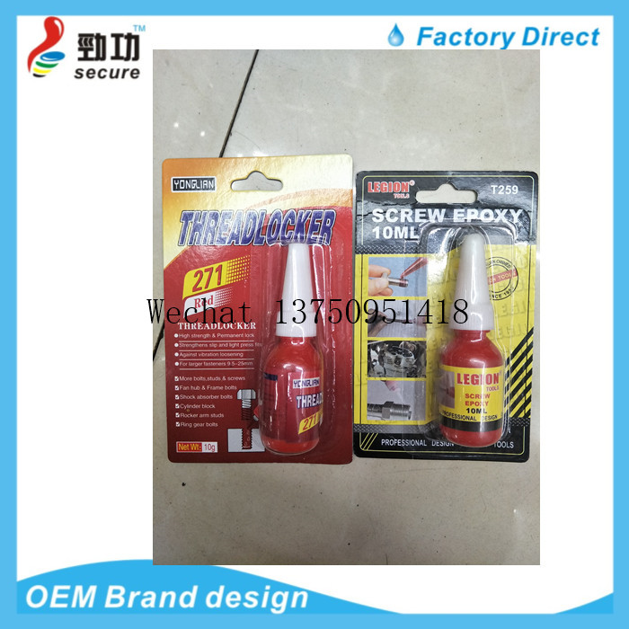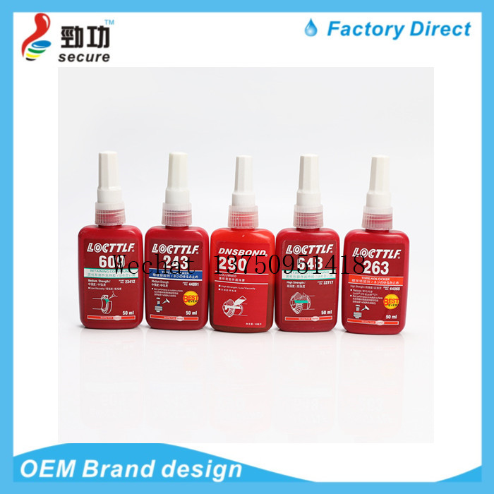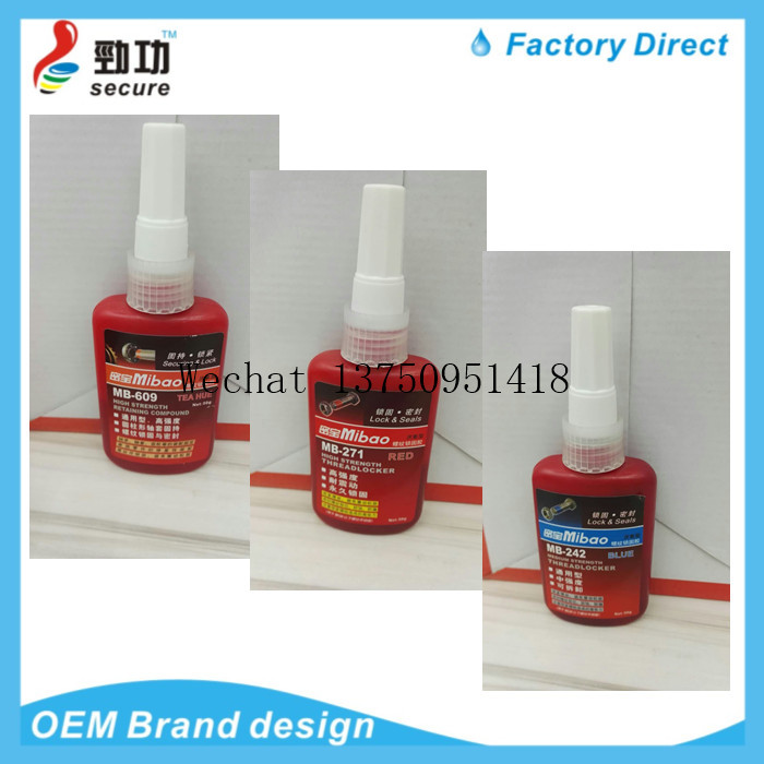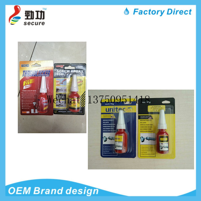Anaerobic adhesive is a single component, high viscosity, high strength thread lock sealant. The product solidifies between two closely matched metal surfaces and is insulated from air to avoid loosening and leakage of threaded fastening. It has the features of heat resistance, pressure resistance, low temperature resistance, drug resistance, shock absorption and corrosion resistance, etc. The curing speed at room temperature is fast, high strength, energy saving, small shrinkage, good tightness, non-solidification of rubber seam, and easy to remove. |