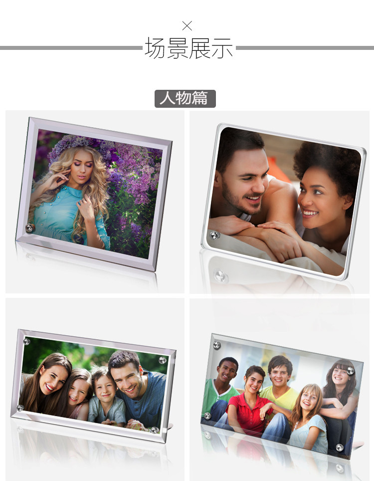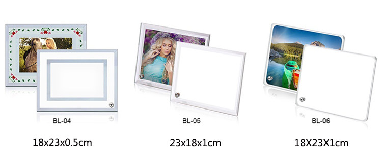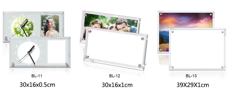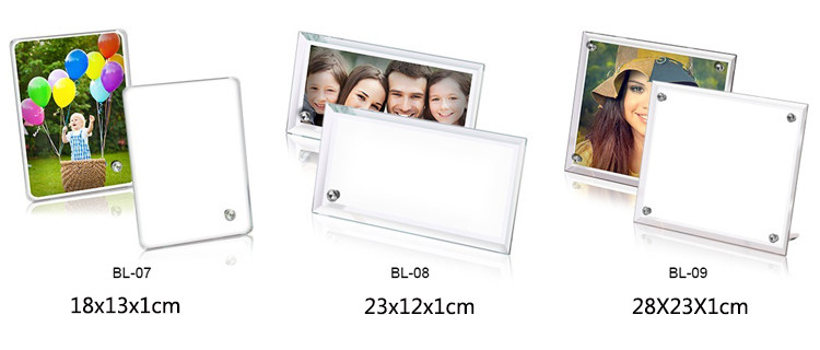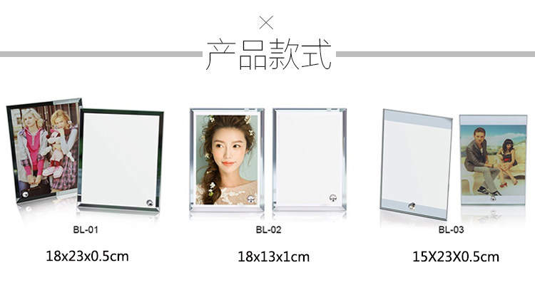 About Product:Material: organic glass whether imports: no categories: geometric shapes hanging form: whether the place adorn patent sources: no size: 8 inch mirror frame (BL01), 6 inch crystal photo frame (BL02), 8 inch mirror frame (BL03), 8 inch mirror frame (BL04), 8 inch bevel crystal photo frame (BL05), 8 inches round crystal photo frame (BL06), 6 inch crystal photo frame (BL07), strip crystal photo frame (BL08), 10 inch crystal photo frame (BL09), 12 inch strip clock frame (BL11), 12 inch strip crystal photo frame (BL12), 16 inch crystal photo frame