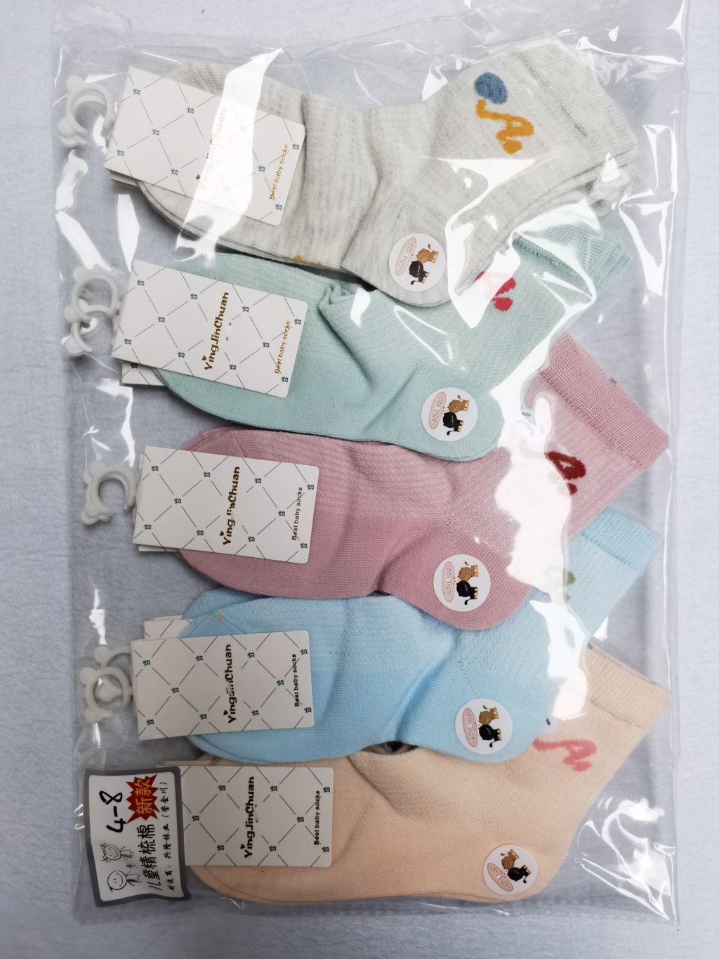 Product Description: This children's socks are made of 100% cotton, with a very soft and breathable feel. The loose-fitting design makes it a best-seller in physical stores, Taobao shops, and wholesale markets. It is a high-quality gift for clothing and children's shoe sellers, with good value for money. We believe that the baby will feel very comfortable wearing it!