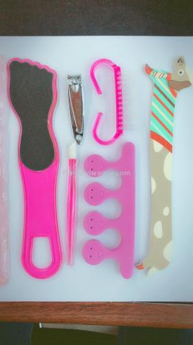 Manicure and pedicure kit seven pieces, nail file, toe splitter. Nail clippers. The foot file. Ox horn brush. Lipstick fork, PVC bag. 6, 000 in stock and 1.5 sets on sale