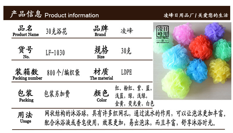 Yiwu Lingfeng Daily Goods Factory is located in the Shangjing Industrial Zone of Yiwu City, adjacent to the Yiwu International Trade City, with convenient transportation. Yiwu Lingfeng Daily Goods Factory is a professional manufacturer of shower flowers.Please provide the Chinese text you want to translate, and I will translate it into English for you.From drawing to processing into a finished productOur factory has a complete production management and product development and sales system, which ensures the stability of product production and product quality. We are able to produce various types of bath flowers.Please provide the Chinese text you want to translate, and I will translate it into English for you.Bath towels, mesh bags, various sizes of cotton swabs, cotton balls, cotton pads, and bath towels, beauty sponges, etc. Since2000Since the establishment of the factory, we have now acquired multiple sets of complete production equipment and a group of high-quality, experienced managers and technicians. We sincerely provide quality service for all customers. Over the years, we have continuously developed new products, which are deeply loved by customers for their unique shape design, interesting styles, and strong practicality. Our products have been sold to many countries including Europe and America, Southeast Asia, the Middle East, and the "Lingfeng" brand products have become popular in major cities across the country.