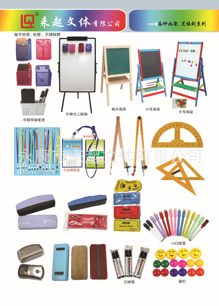 Yongkang Laiqi Culture and Sports Co., Ltd. is located in the famous "Capital of Hardware."—Yongkang。Our factory specializes in the production of educational and office supplies.Please provide the Chinese text you want to translate, and I will translate it into English for you.A production and processing enterprise that integrates design, development, research and development, production, sales, and service, with main products including whiteboards, blackboards, greenboards, cork message boards, enamel boards, children's writing boards, and related products such as whiteboard pens, erasers, magnetic particles, display racks, drawing boards, easels, frames, and more. The products are widely used in offices, schools, and homes, with more than 90% of the products exported to countries and regions such as Europe, the United States, the Middle East, Africa, Japan, and South Korea.Please provide the Chinese text you want to translate, and I will translate it into English for you.