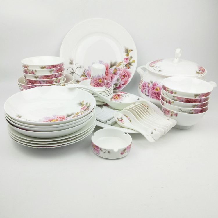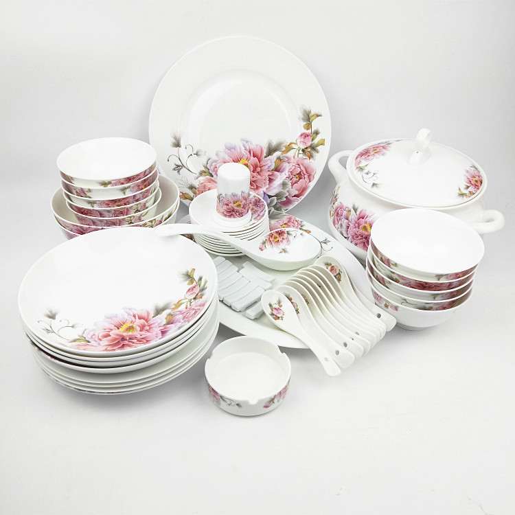 产品说明:景德镇陶瓷中式骨质瓷餐具碗盘碟套装组合家用中国风红花喜庆礼品