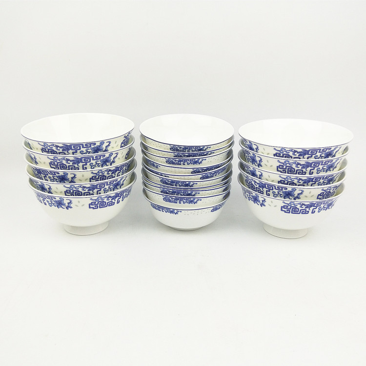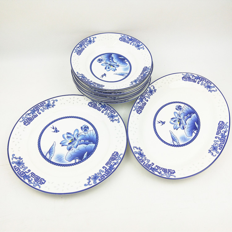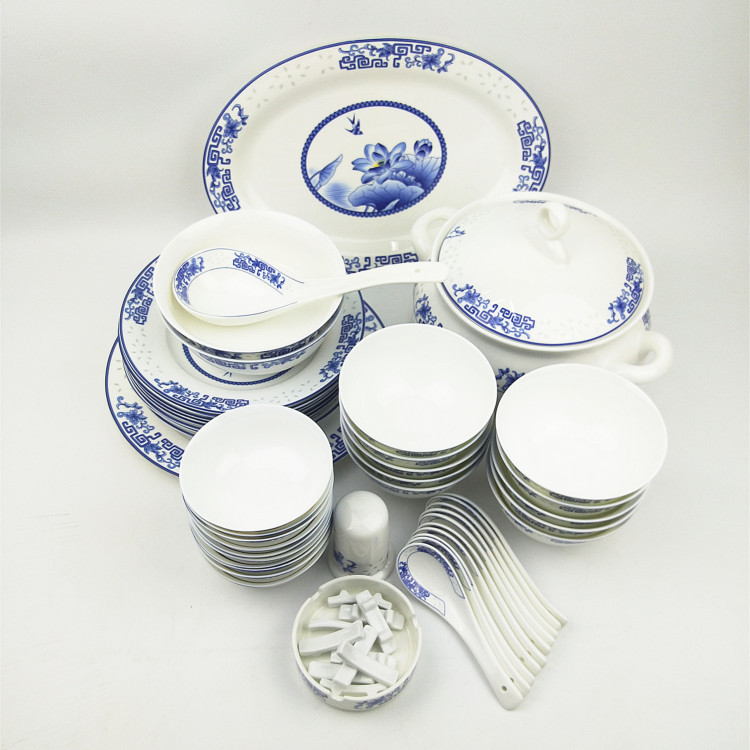 产品说明:景德镇骨质青花瓷56头中式餐具碗盘碟套装玲珑荷塘月色喜庆礼品