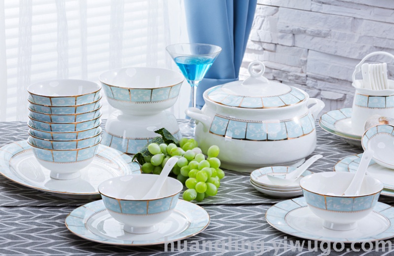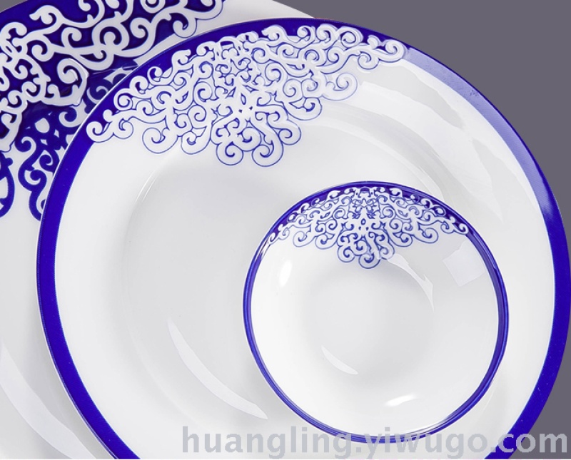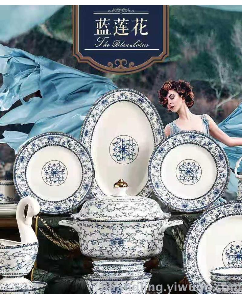 Jingdezhen Chinese-style blue and white porcelain with gold-painted decoration and high-grade bone chinaThe products of our factory are characterized by their regular appearance, smooth glaze, thin and delicate body, and high transparency. After being fired at high temperature twice, the first is the green-glazed firing at 1200-1380°C, and the second is the glaze firing at 850-990°C, making them lead-free, non-toxic, and never-fading green ceramics.