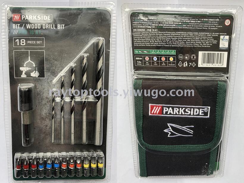 18-piece set of twist drill bits with a connecting rod, a cloth pouch, and a double-bladed set
