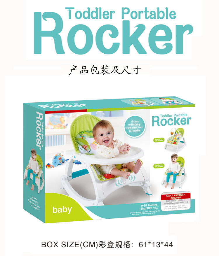 About Product:Product name: multi-function baby rocking chair + dining table + music\nPacking method: color box\nSpecification of color box: 61*13*44CM\nSpecification of outer box: 87*47.5*65CM\nCarton capacity: 6 boxes\nGross weight: 23.2 KGS\nNet weight: 19.2 KGS