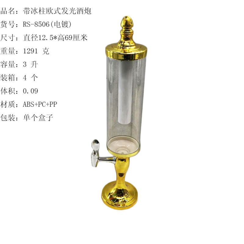 ITEM NO.【Product Model Number】: RS-8506 (with light) NAME【Product Name】: Ice Column European Style Wine Cannon QTY【Quantity】: 4 pieces "CBM【纸箱体积】:0.09 Material【Product Material】: ABS+PC+PP Color【Product Color】: Golden, Silver Weight【Product Weight】:1291 grams