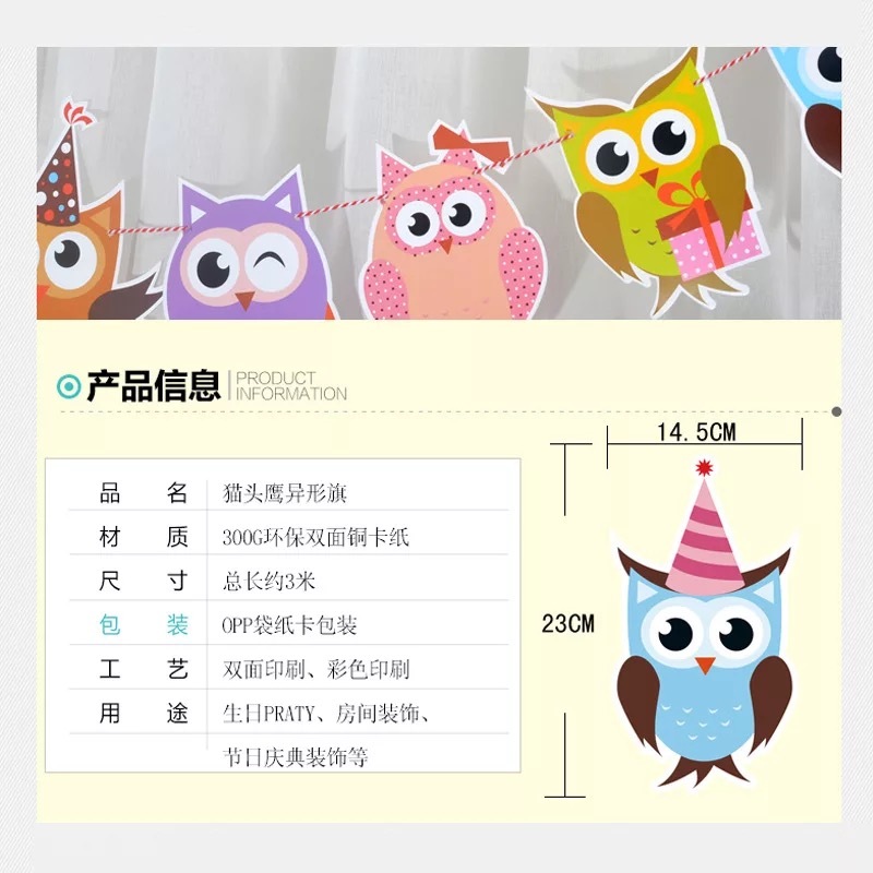 尺寸:串旗是10片猫头鹰异形旗组成 棉绳长3米左右 宽12.5厘米 长23厘米