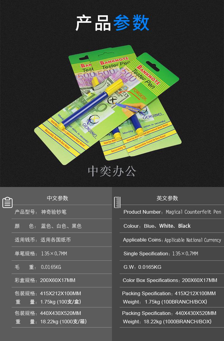 To test the currency of various countries, the method is simply to lightly draw a pen on the currency. If the color remains the same, it is genuine currency; if the color turns black, it is counterfeit currency. This is simple, convenient, and practical. With this pen in hand, you are not afraid to distinguish between genuine and counterfeit currency. The packaging is in a card packaging.
