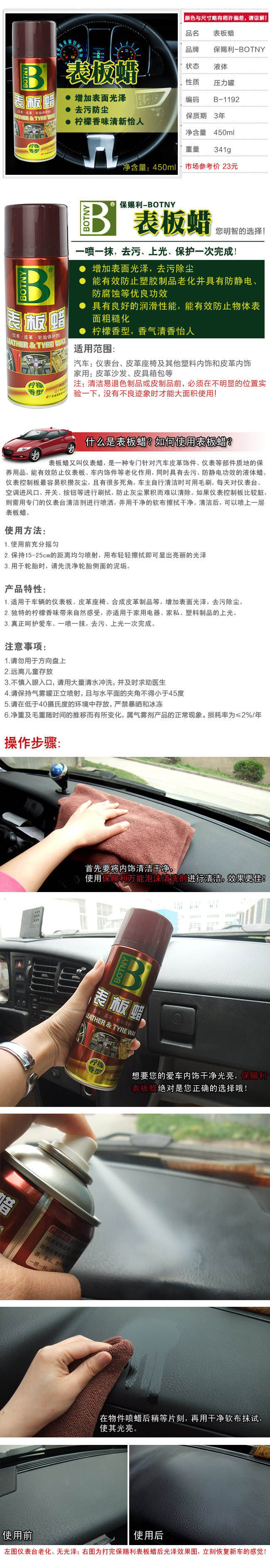 Suitable for vehicle dashboard, leather seats, synthetic leather products, etc., to increase the surface luster and remove dirt and dust. The unique lemon fragrance brings a natural feeling, and can also be used for the polishing of household appliances, furniture, and plastic products. Truly care for your car. With one spray and one wipe, you can complete the cleaning and polishing in one step.