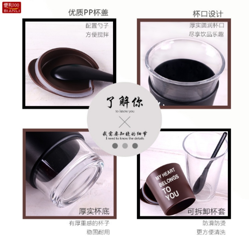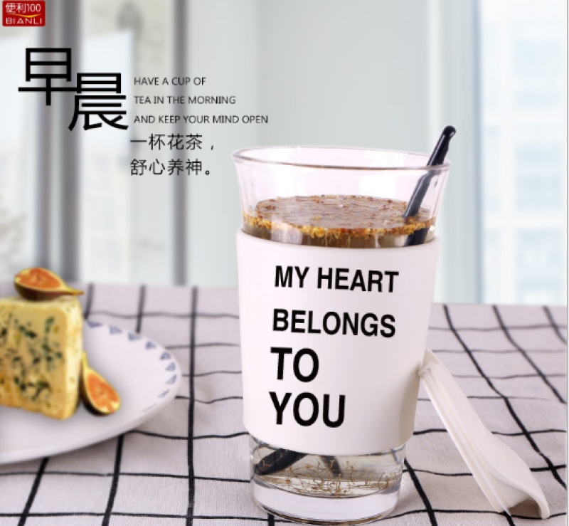 Korean creative coffee mark cup simple couple anti-hot with spoon cover portable office scented tea glass water cup