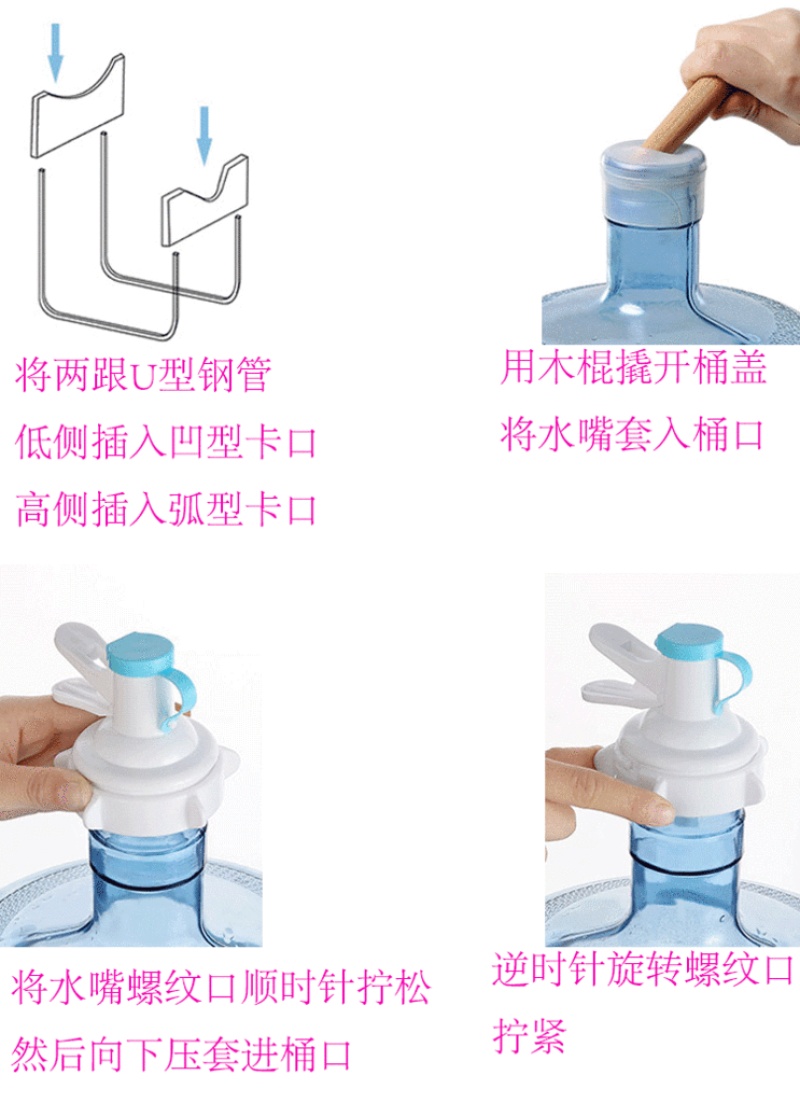 About Product:Removable water barrel stand, made of high quality stainless steel U tube and pp material to give you a healthy drinking environment. The product includes 1 water faucet, 2 U-shaped stainless steel pipe and 2 bayonet. 30 in a box. The price is negotiable